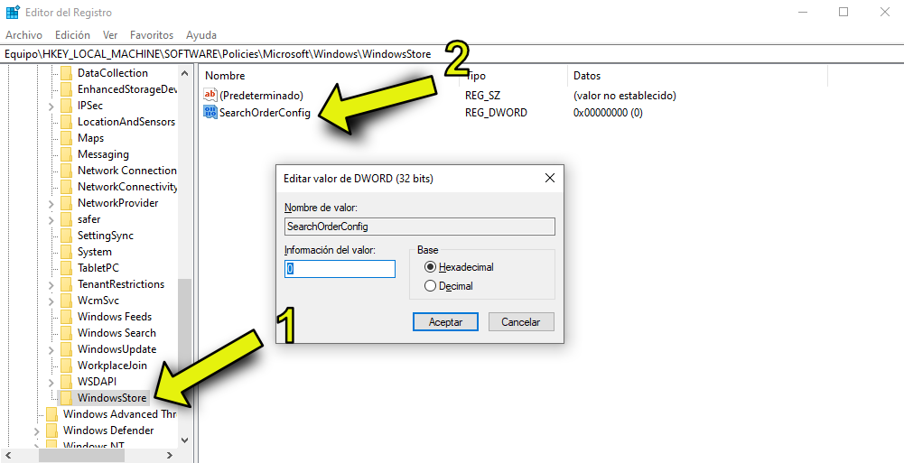 Ahora sobre la carpeta que creaste en el lado derecho crea o modifica el valor REG_DWORD “SearchOrderConfig”, dale doble clic para abrirlo y coloca el valor cero (0). Si tuvieras que crearlo entonces hace segundo clic sobre el panel derecho “Nuevo > Valor de DWORD (32 bits)” y coloca el nombre “SearchOrderConfig” con el valor cero (0).