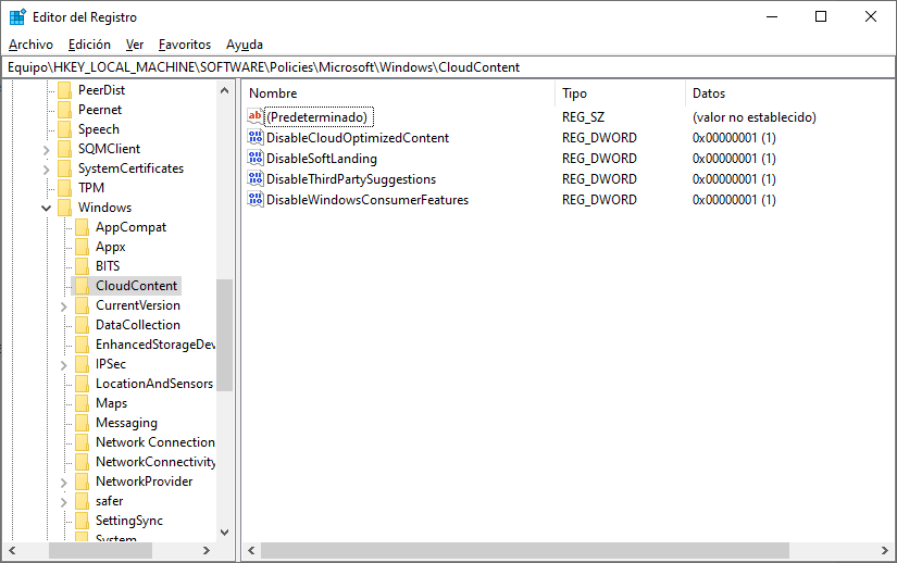 HKEY_LOCAL_MACHINE\SOFTWARE\Policies\Microsoft\Windows\CloudContent