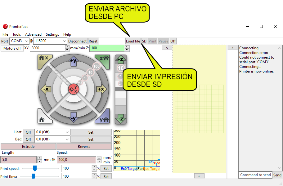 De esta manera podremos hacer todas las tareas básicas de la impresora, mover los ejes, cambiar filamento, extruir, calentar la cama o hotend, ver la temperatura, tiempo de impresión y mandar archivos GCODE para impresión.